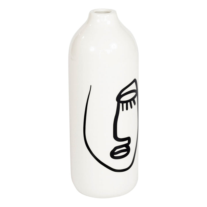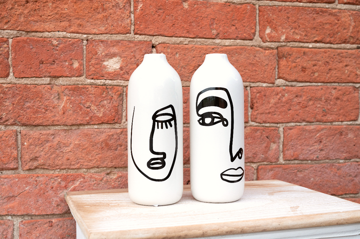 This set of 2 ceramic monochrome face vases would be a stylish addition to any home. These items are simple in design and would be easy to place in any styled room. A set of 2 ceramic face vases with the bases 8cm each and the top 3cm wide with a 2cm opening, with individual volumes of approx 740ml. Overall measurements are: D8 x H23 x W16cm SKU: TJN0376