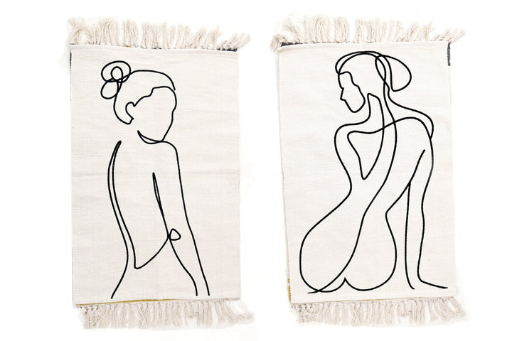 A pair of natural cotton white rugs with female silhouette design. Two female silhouette poses printed on cotton rugs with tassels. Each rug measures: L90 x W60cm SKU: WO0038