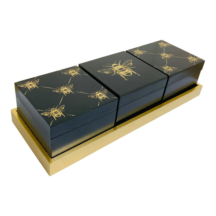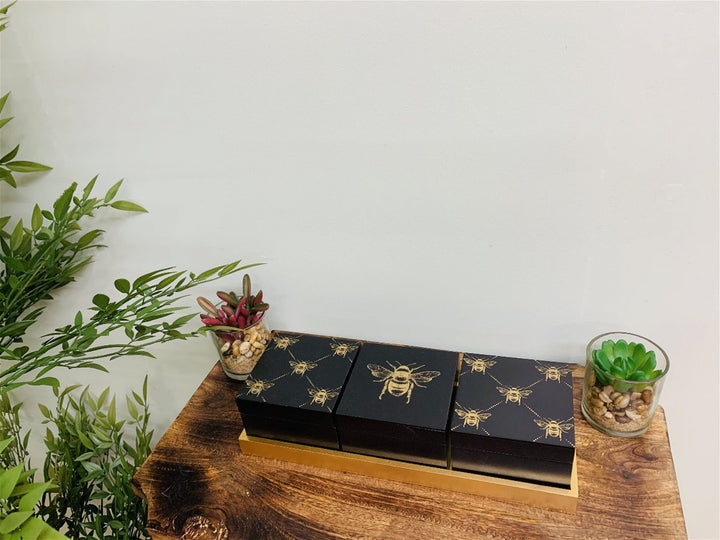 This set of three bee designed storage boxes set in a gold colour tray. The design and colours are very appealing and offer multitude of uses. The gold holding tray is 2.4cm deep and houses three wooden black storage boxes 10x10cm with a gold bee design on the lids with an internal size of 5.5x5cm. When nested the measurements are: D11.5 x H7.5 x W32cm SKU: TJBE28