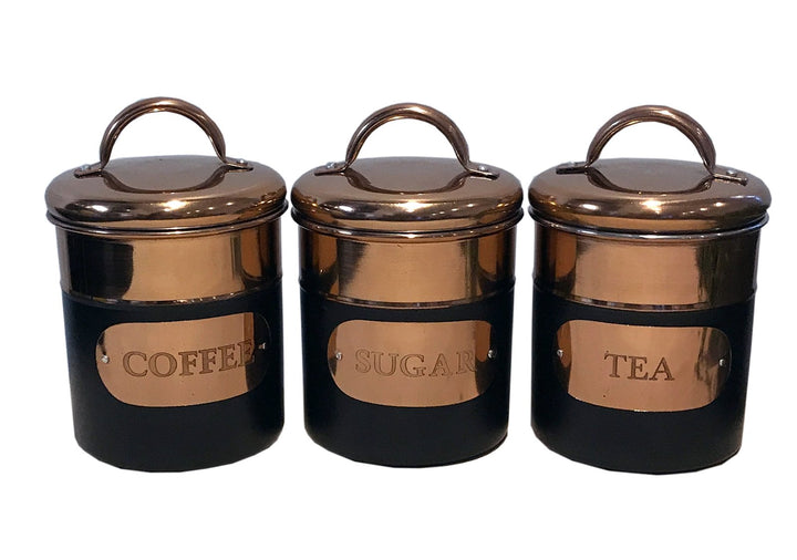 Set of 3 Black & Copper Tea, Sugar & Coffee Tins