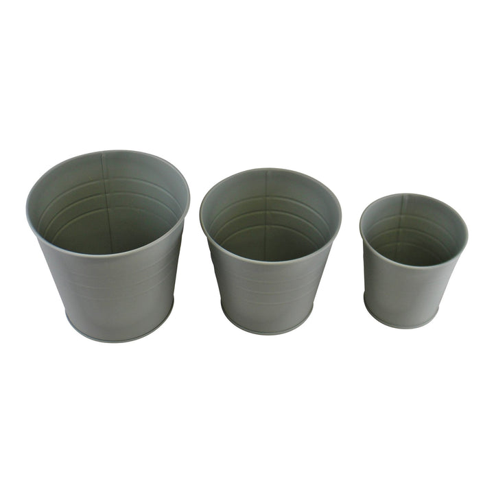 A set of 3 metal bucket style planters from our potting shed range. In a soft, sage green colour. Made of 100% Zinc. Size of each planter: Large 15.5x15.5x14.5cm. Medium 14x14x12.5cm. Small 11x11x10.5cm. Measurements: 15.5 x 14.5 x 15.5cm SKU: PS0086
