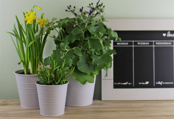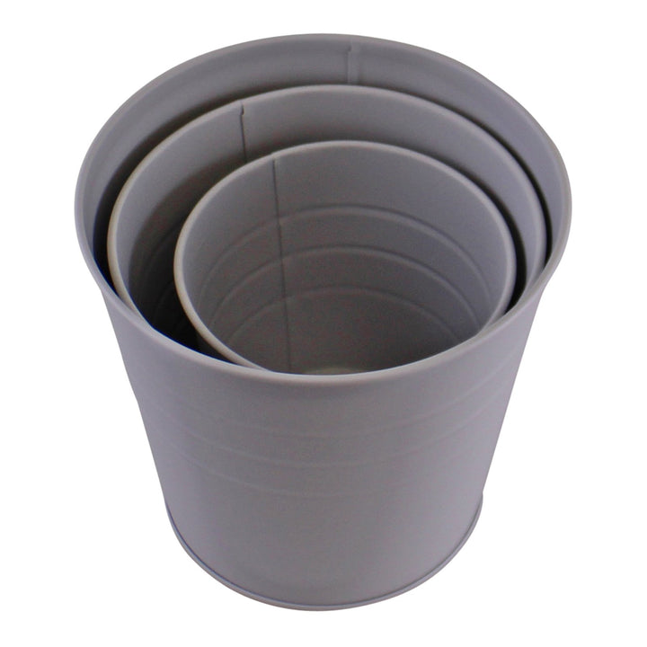 A set of 3 metal bucket style planters from our potting shed range. In a subtle grey colour. Made of 100% Zinc. Size of each planter: Large 15.5x15.5x14.5cm. Medium 14x14x12.5cm. Small 11x11x10.5cm. Measurements: 15.5 x 14.5 x 15.5cm SKU: PS0086