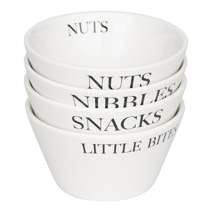 This set of four round white snack bowls has black text with nibbles, little bites, nuts and snacks on them. Would be perfect for al fresco dining and ideal for entertaining at home. Each of the bowls has a top diameter of 11.5cm and a base of 6.5cm with a depth of 6cm. The measurements for each bowl are: D11.5 x H6 x W11.5cm SKU: OR0481
