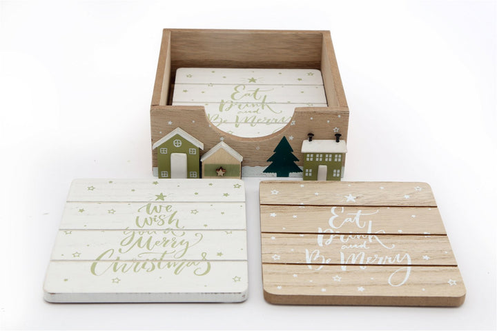 A set of 4 wooden coasters stored in a lovely little festive box, each with a Christmas message. Two with "Eat, Drink and be Merry" and two with "We wish you a merry Christmas". A set of coasters with a natural but festive feel and dimensions of 10x10cm. The set comes complete with wooden holder for easy storage. Overall measurements: D11.5 x H4.5 x W11.5cm