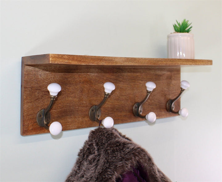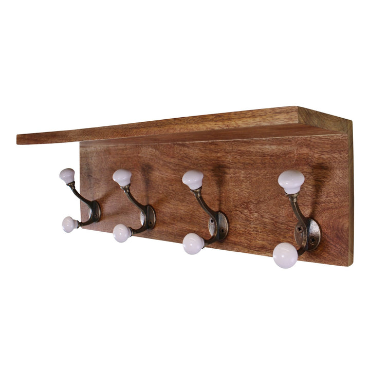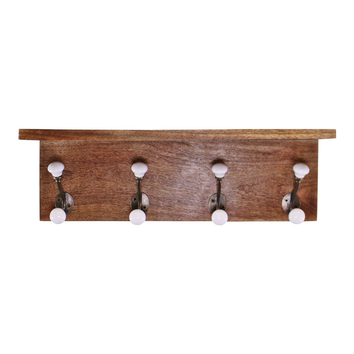 A stylish and simple set of 4 double coat hooks on a wooden base. The knobs are white and ceramic with the addition of a shelf above the hooks. Ideal addition to a hallway, conservatory or porch. Wooden base 45x14cm each double hook 9cm high x 6cm deep. Maximum load weight 5kg. The base is made of mango wood and the knobs are ceramic with metal detailing. There are 2 fittings to the rear for wall hanging. The top shelf measures 45cm wide and 12cm deep. Measurements: D12 x H14 x W45cm