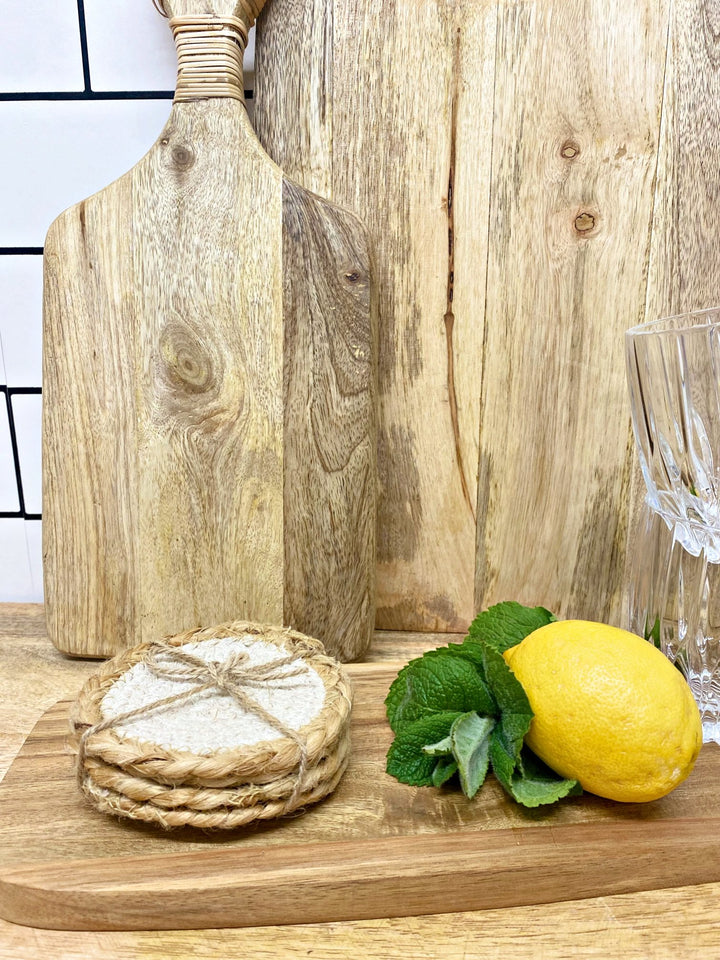 A lovely set of four coasters, made from woven jute and spiralled cotton. The hard-wearing nature of jute and the soft natural tones mean they are perfect for use all around the home. Set of 4 tied with jute string. Shades and markings will vary due to the natural variations of the material. Measurements: D2.5 x H9.5 x W9.5cm