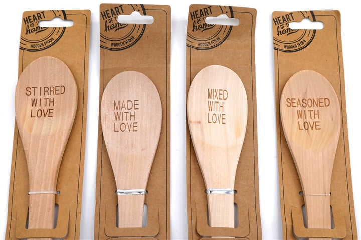 Set of four wooden mixing spoons, each engraved with different love themed slogans. 'Stirred with love' 'Made with love' 'Mixed with love' 'Seasoned with love'. Each wooden spoon weights 40 grams. Please note assortment may vary, set of four may include two of the same slogans. Measurements: D1 x H30 x W5cm