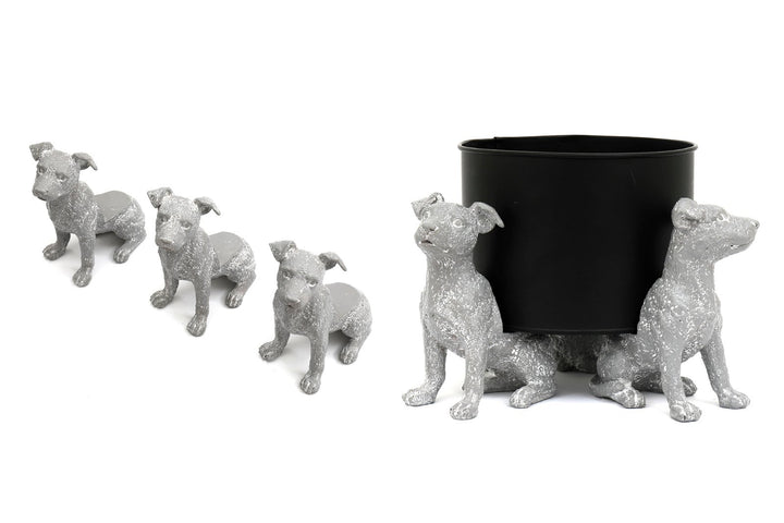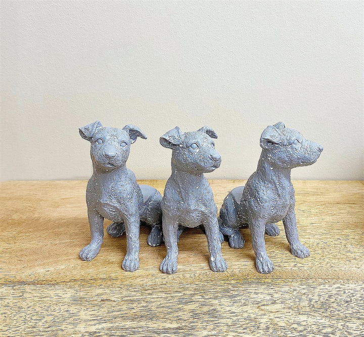 A decorative set of 3 pot feet/stands with outward facing sitting dogs. This set can be used outdoors to raise pots off the floor to prevent water logged plants, or indoors to add decoration to your pots. The dogs are made from poly resin and have a grey stone effect. 6cm x 12cm x 13cm. Measurements: D13 x H14 x W21cm