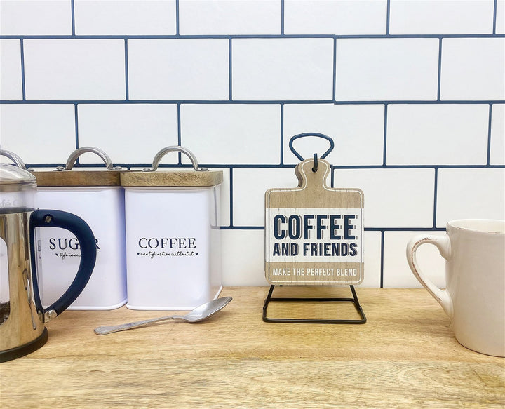A set of 6 wood effect coasters with a Coffee slogan that hang on a handy metal base for storage when not in use. Each coaster measures approximately 10cm x 13cm. The coasters are made of MDF and the slogan is printed in black. Overall measurements are: D7 x H20 x W11cm