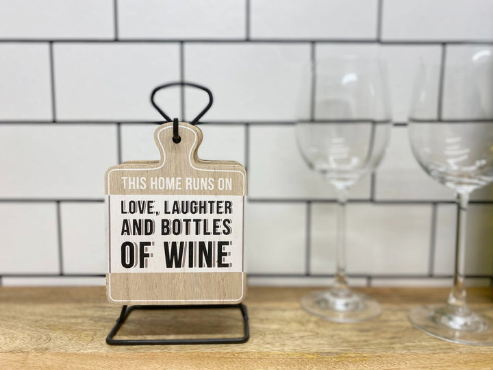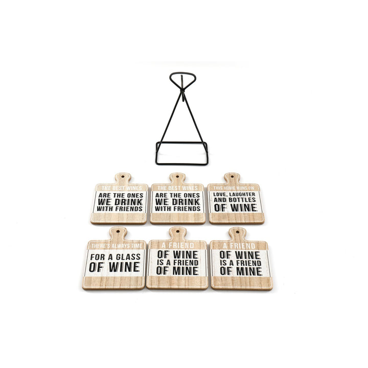A set of 6 wood effect coasters with Wine slogan that hang on a handy metal base for storage when not in use. Each coaster measures approximately 10cm x 13cm. The coasters are made of MDF and the slogan is printed in black. Measurements: D7 x H19 x W10.5cm