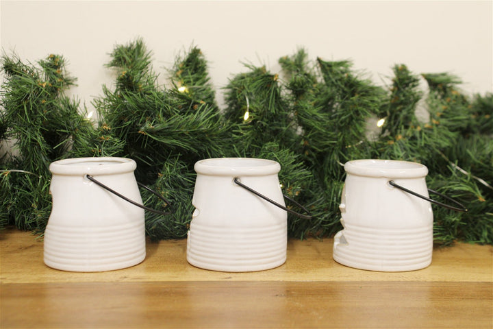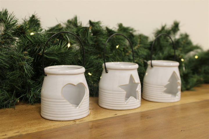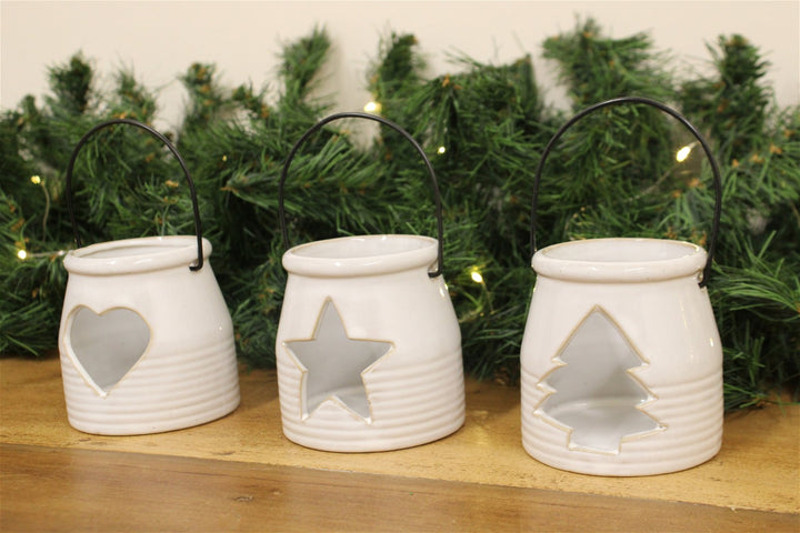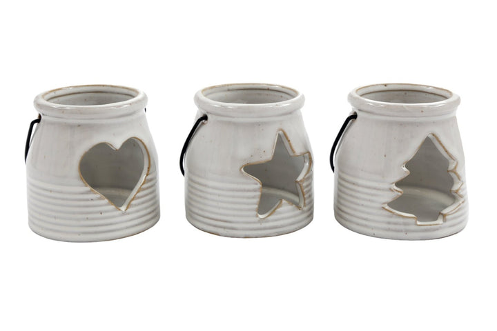 Set of three porcelain tealight holders with metal handles. Consists of Heart cut out tealight holder, Star cut out tealight holder and Christmas Tree cut out tealight holder. Measurements: D8 x H8 x W8cm