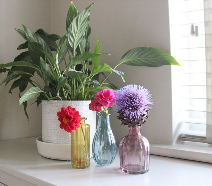 Set of three colourful ribbed glass vases. Brighten up your space with these stunning coloured glass bud vases. Featuring a smooth glossy finish and embossed ribbed pattern, a great way to add a touch of elegance and Boho style to your home. Measurements: D7 x H14 x W7cm