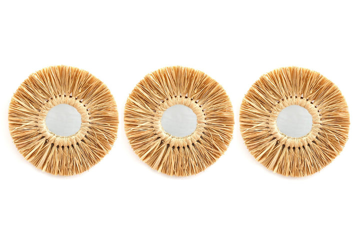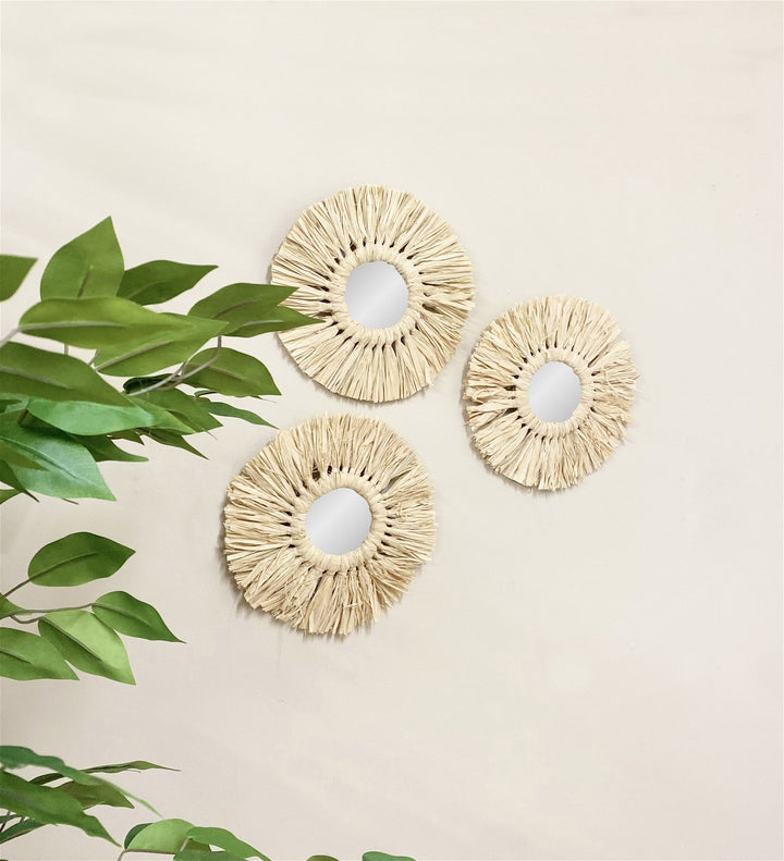 Trio of dried grass mirrors, perfect for adding a touch of beachy Boho to any interior scheme. Each mirror comes fitted with a wall hanging bracket on the back. Measurements: D1 x H69.5 x W25.5cm