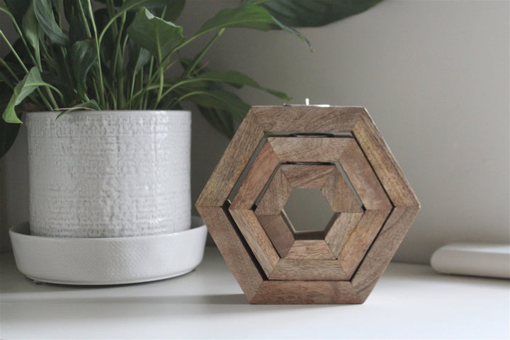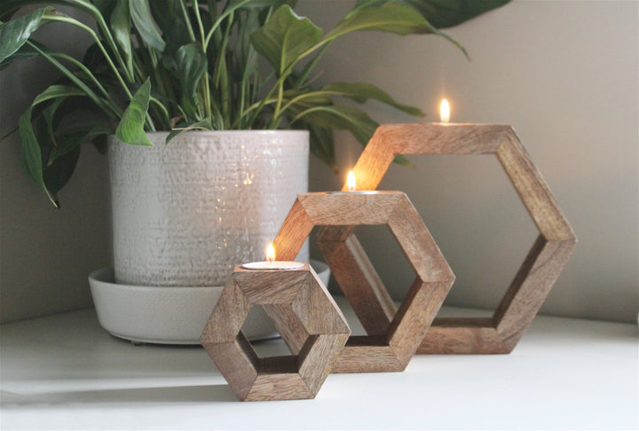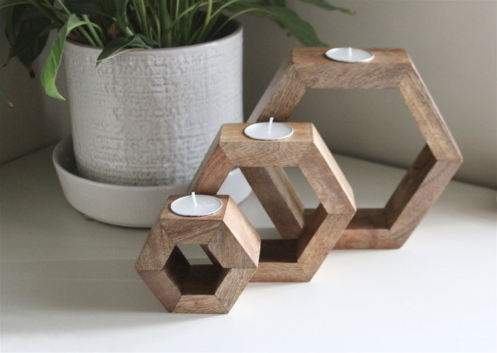 Set of three hexagon shaped tealight holders, crafted from mango wood and finished with a clear varnish to protect and enhance the natural grain of the wood. This set of three hexagon tealight holders includes varying sizes, allowing you to create a visually interesting display on a table, mantle, or shelf. Made of high-quality mango wood, which gives them a unique, natural look that's perfect for any home decor style. Perfect gift idea, comes complete with tealights. Measurements: D5 x H18 x W20cm