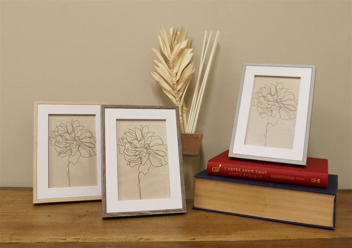 Set of three 6x4' photo frames featuring three different colourways. Grey, natural and brown. Can be displayed free-standing or wall hanging. Measurements: D1.5 x H19 x W14cm
