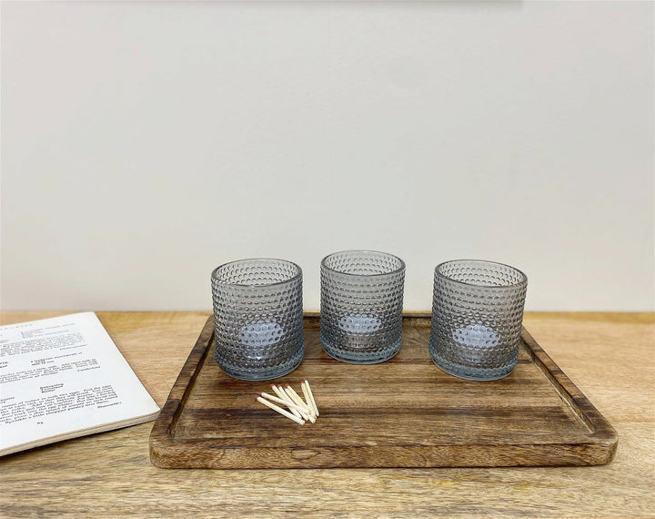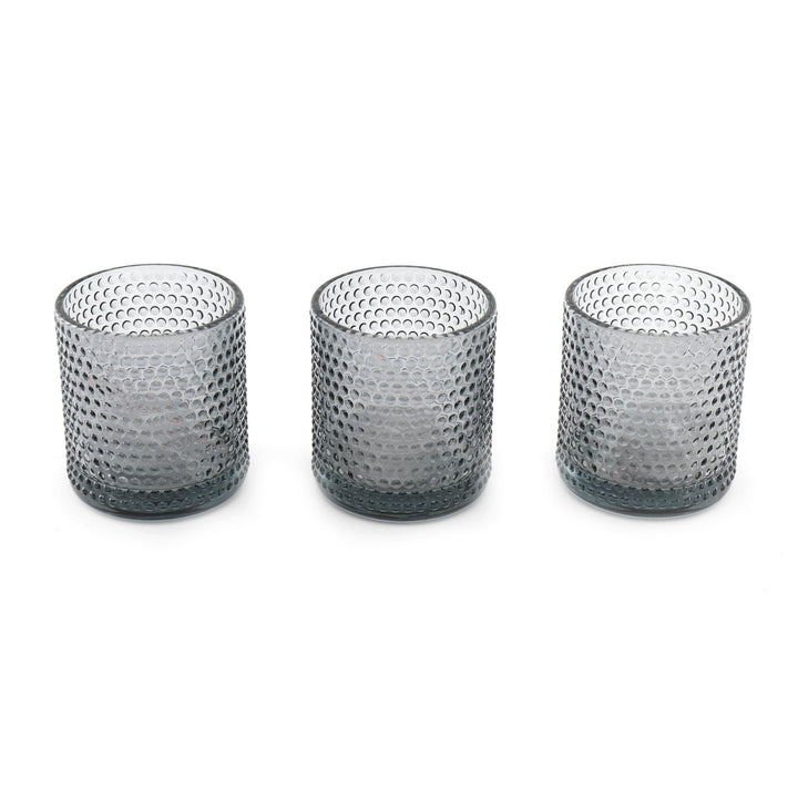 A set of 3 smoked glass tealight holders with a regular stippled effect. The set comes packaged with 3 fragrance tealights and would make an ideal gift. Measurements: D7 x H8.5 x W22cm