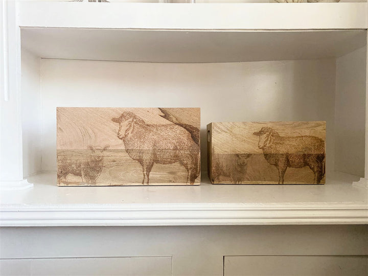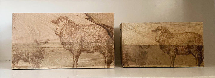 Set of two wooden crates engraved with a portrait of a ewe and its lamb. A useful pair of storage crates with handles that could be featured throughout a home. The small crate fits inside the larger crate. The smallest crate measuring (W x D x H) 28cm x 20cm x 15.5cm. Measurements: D25.5 x H19 x W35cm