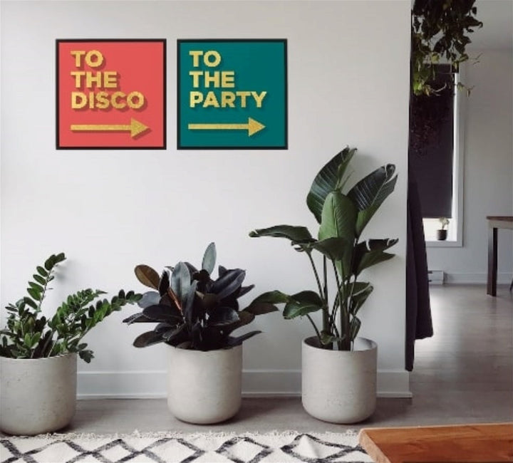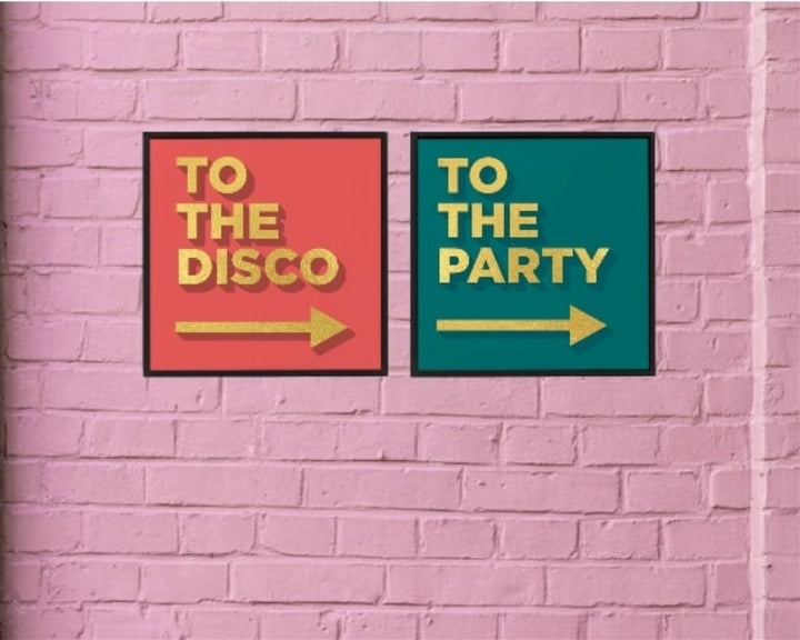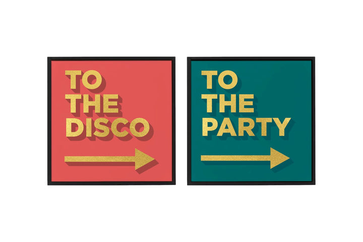 Add a retro flair to your home with this pair of vibrant framed prints. Fun and funky prints, featuring bold gold typography set in a black square frame, creating an eye-catching wall art statement. These prints come framed and ready to hang from any wall or displayed on a shelf. Measurements: D2.5 x H31.5 x W31.5cm