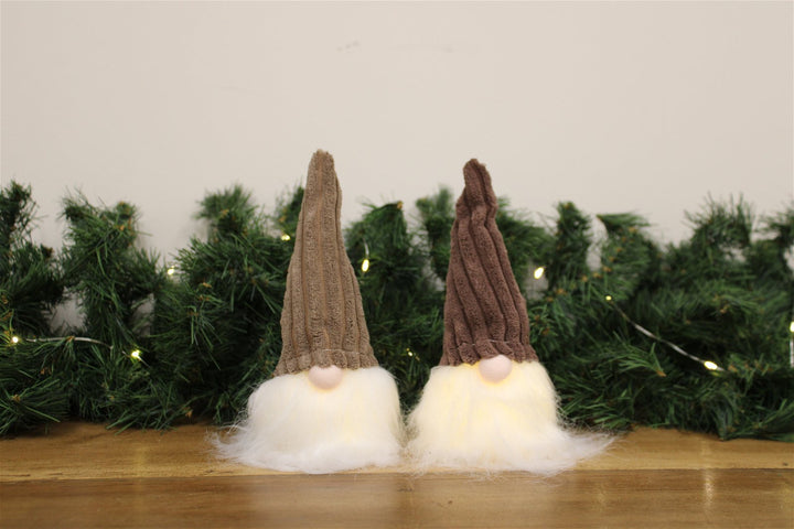 A pair of neutral themed Gonks, with tall plush hats and LED white beards. Requires two LR44 batteries, included in both Gonks. Measurements: D6.6 x H18 x W6.5cm