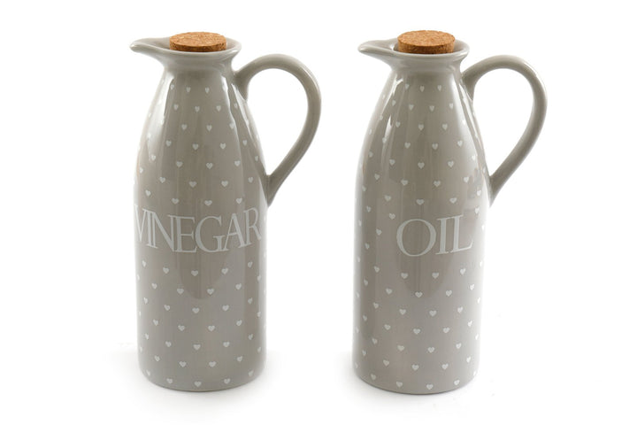 A pair of grey ceramic oil and vinegar pourers with a heart design and a glazed finish. Both pourers have cork stops. A chic and practical addition to any kitchen or dining area. This set are a part of the Hearts collection. Measurements: D8 x H20.5 x W16.5cm