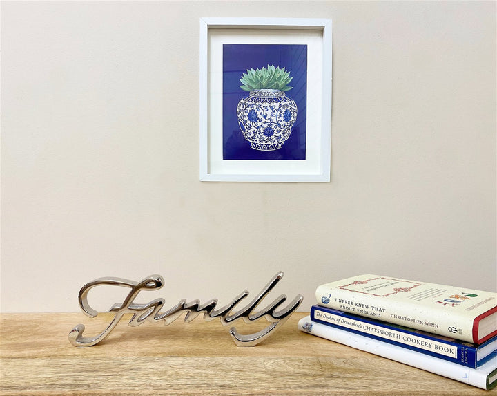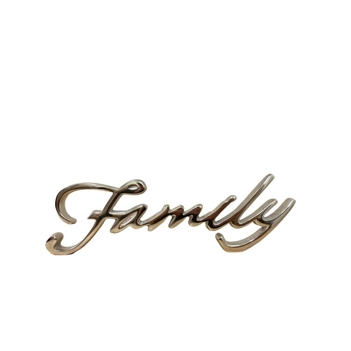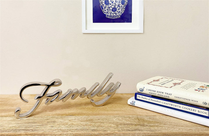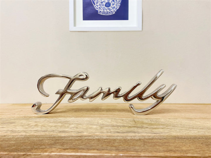A freestanding FAMILY ornament in silver metal perfect for a shelf, window sill or mantelpiece. This item has a highly polished aluminium exterior and is crafted with a cursive font. Measurements: D9 x H2 x W30.5cm