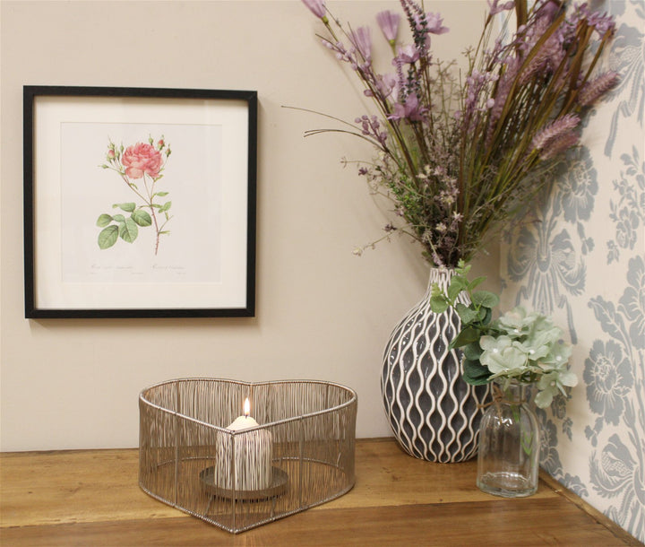 A simple but elegant candle holder, crafted from iron into a heart shape. With space on the candle plate to hold one pillar candle up to 10 cm in diameter. Measurements: D27 x H11 x W26cm