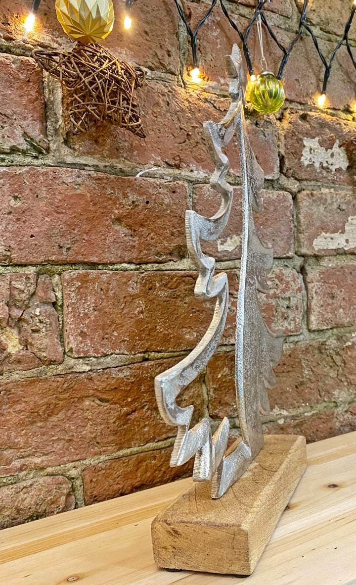 This contemporary decoration is striking and interesting. Sitting on a wooden plinth the silver Christmas tree shape is of two halves, one side being solid the other cut out. The wooden plinth is 18cm x 6cm x 2.5cm. The silver tree form is 29.5cm x 26cm. Measurements: D6 x H32 x W26cm