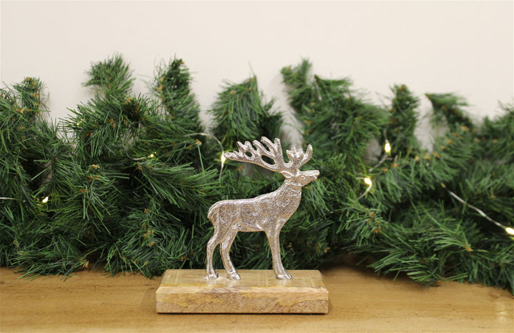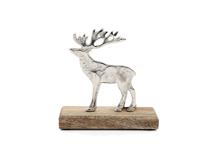 Silver reindeer on wooden plinth. Made from 100% Aluminium and Mango Wood. Measurements: D5 x H12.5 x W12cm