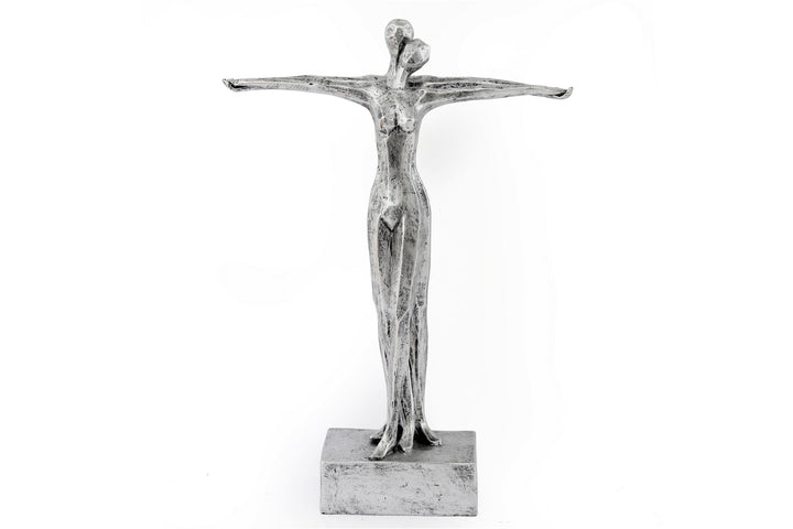 A modern art figurine in a tarnished silver colour of a couple standing behind each other with arms splayed. Made of polyresin. The base is 11cm x 7cm x 4cm. This statement piece will add a touch of style to any room. Measurements: D11 x H39.5 x W30cm
