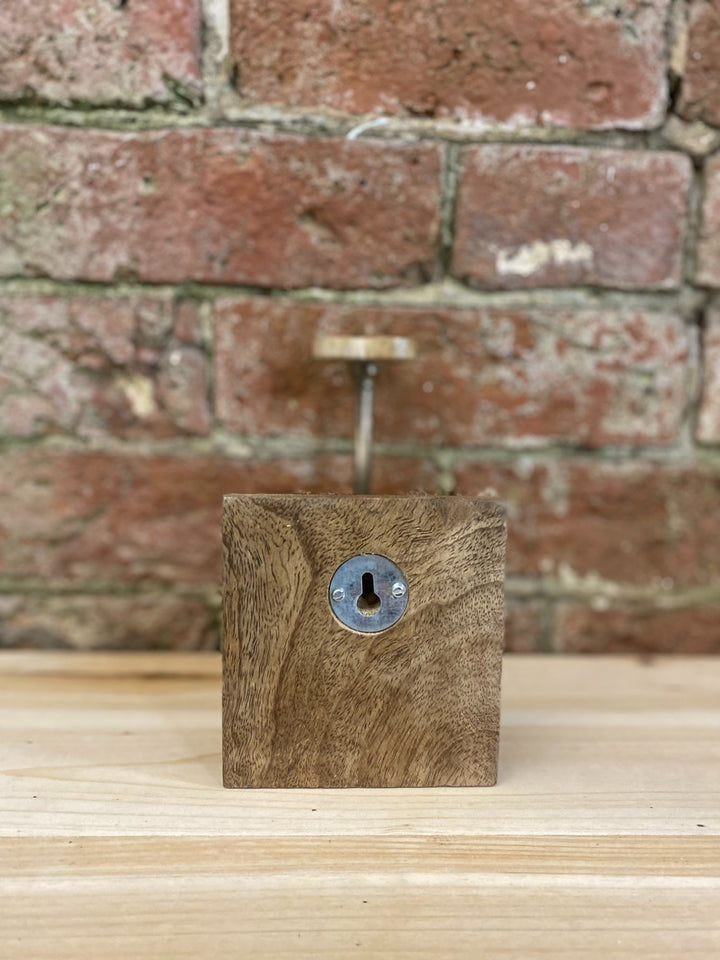 A natural bevelled edged mango wood square plinth with one tarnished brass double coat hook. This has a beautifully carved heart shaped knobs that is decorated with a smaller heart shape. An attractive piece of wood work that is both practical and functional for every home. Overall Measurement: D12x H10.5 x W10cm Hook Measurement: D10 x H14 x W4.5 SKU: KG2009