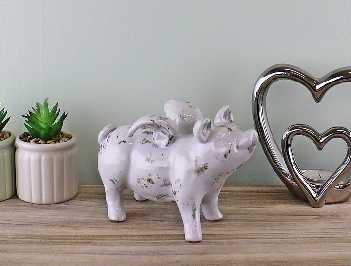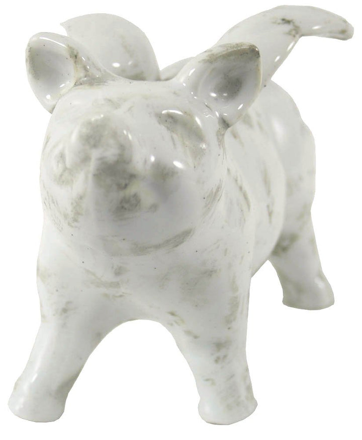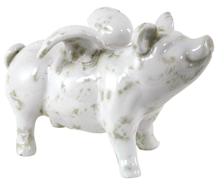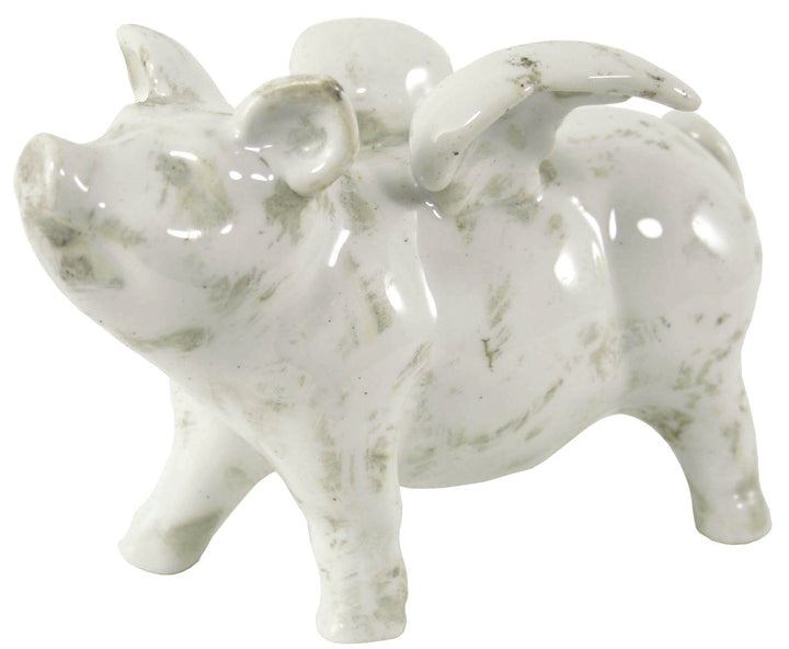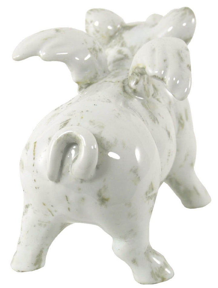 This adorable small ceramic winged flying pig will make a cute addition to any home. Perfect gift for animal lovers. Made of ceramic, white in colour with a hand finished patina to give the product an aged finish. As the product is hand finished there will be small variations between products. Measurements: 8 x 13 x 18.5cm