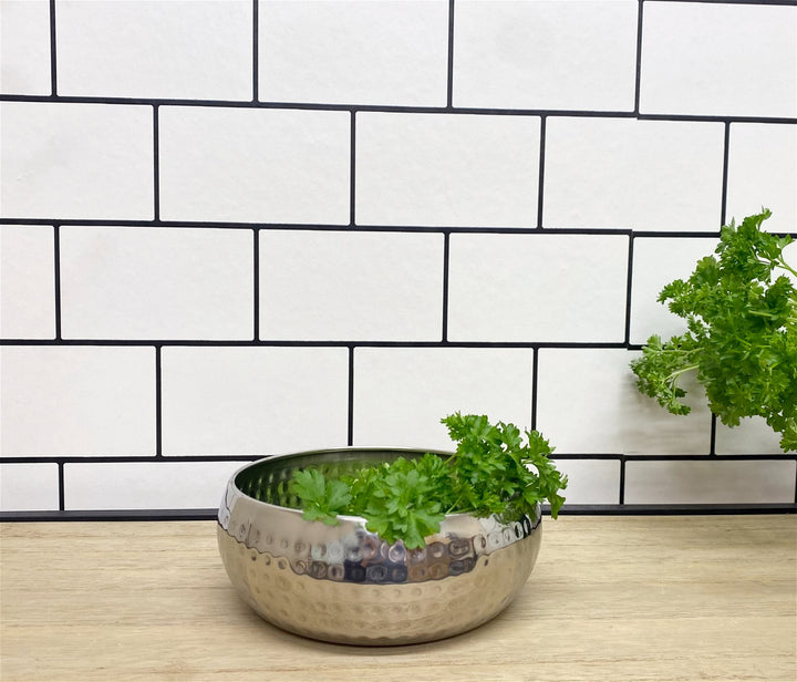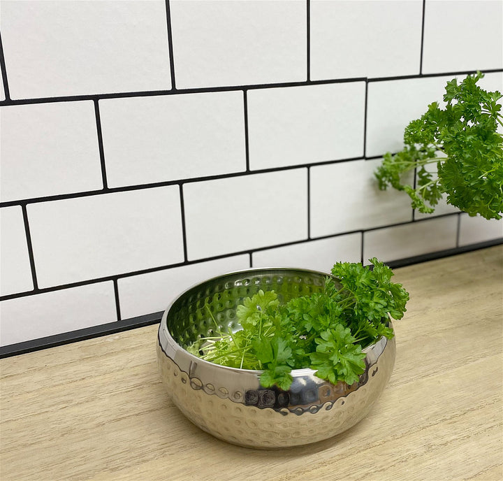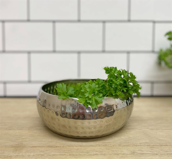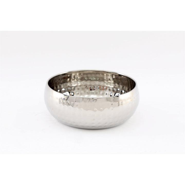 A small bowl in silver with a highly polished and hammered outer surface. This stylish bowl would be perfect as a decorative item and also have many uses within any home. Base diameter 12cm, top opening diameter 14cm. Measurements: D16 x H7 x W16cm