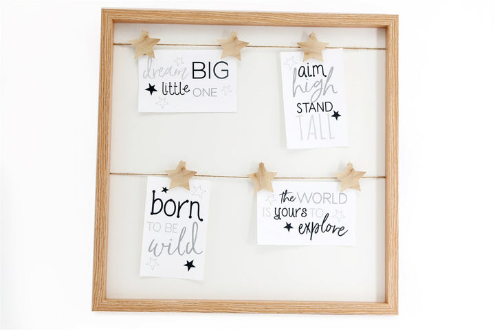 This natural wood square photo frame has six small pegs decorated with carved stars that are fixed onto a length of string. The pegs are positioned to clip photos of 4 x 6 onto, both in portrait and landscape. Overall measurements: D2.4 x H42 x W42cm SKU: BB0391