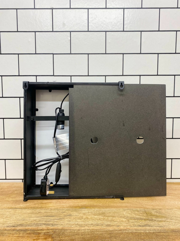 Retro black light box with STAGE DOOR and an arrow signage. This product can be wall hung with two metal fixings for easy hanging or alternatively two screw holes at the base for securing on a surface. The box requires two maximum 25 watt bulbs, not included, UK plug included with cable length 1.78m. The access to the bulbs are from the back with a sliding panel. Measurements: D34 x H13.5 x W40cm