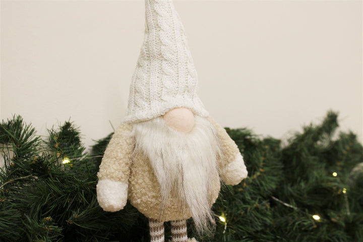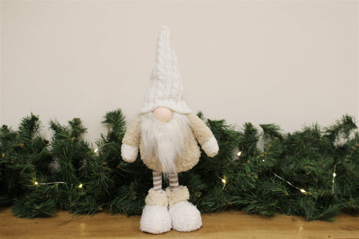 Free-standing Gonk with white knitted hat and boots. The hat is strengthened for support and styling. Measurements: D9 x H34 x W16cm