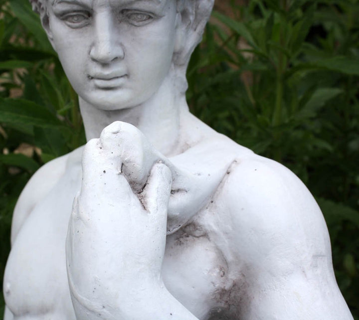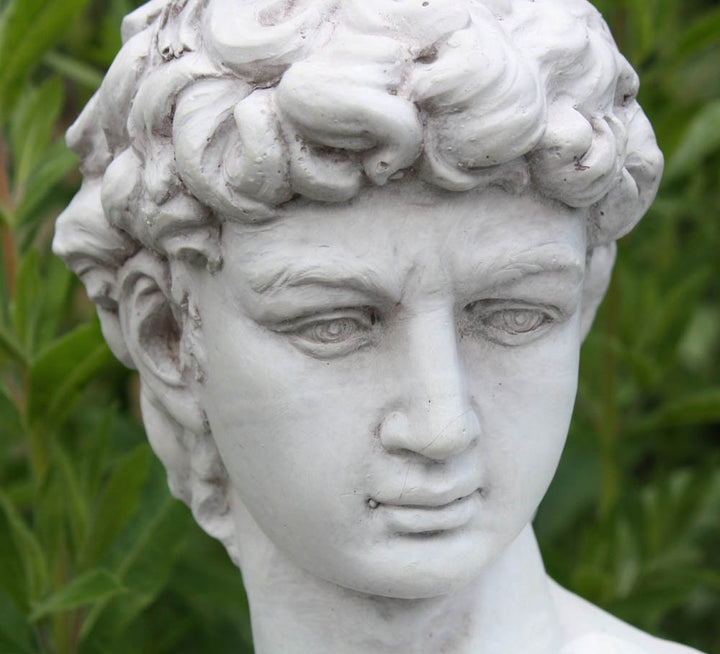 This Italian inspired 'Michelangelo's David' figure stands 86 cm tall and would add a touch of style and grace to your garden. It is made to resemble smooth or weathered stone or marble. Part of our stunning range of Polyresin stone-effect garden ornaments. Built to last and extremely durable. Measurements: 35.6 x 22.9 x 86.4cm