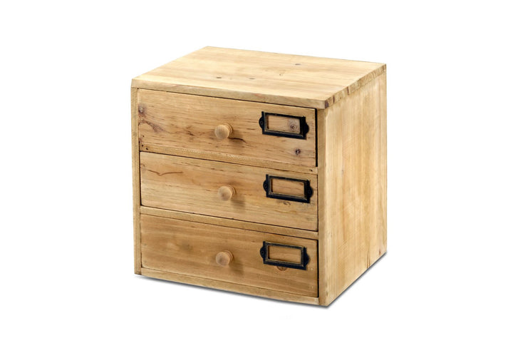 Very useful small set of 3 wooden drawers complete with wooden handles and metal holders. Ideal for storage of smaller items in home office. Drawers sturdy and well made. Measurements 28 x 23 x 28cm. Internal draw measurements are width 23 x depth 20 x hight 6 cm. The nameplate card insert size is 50 x 25mm with a display area of 45 x 20mm (not included).
