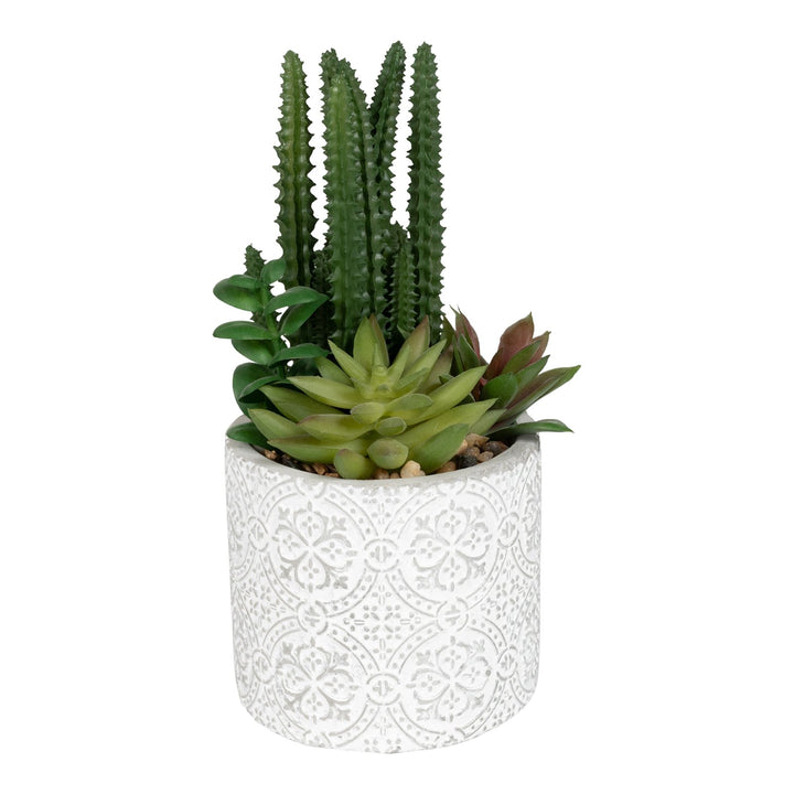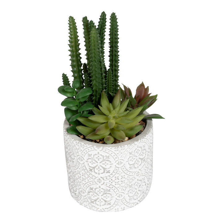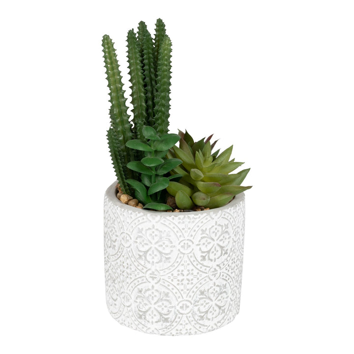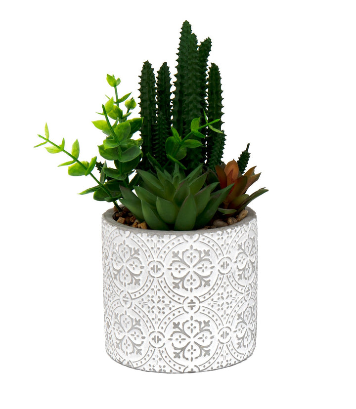 Green faux succulent in a white Aztec styled clay pot with gravel bedding. The two slightly different types of succulents will be dispatched as random. The white Aztec clay pot stands at 9cm in height. The overall pot and plant measurements are: D9.5 x H20 x W9.5cm SKU: SR0076