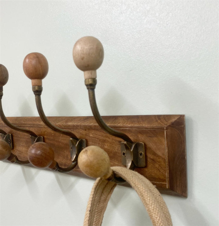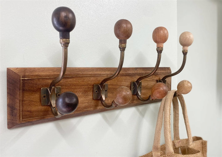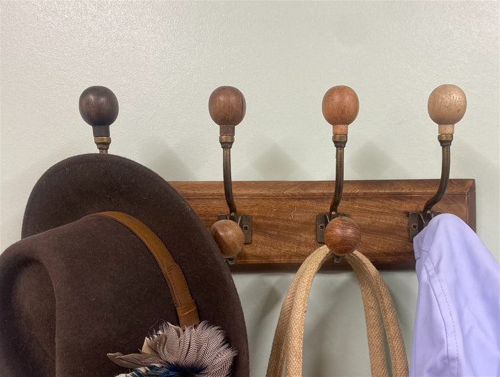 Four double coat hooks from the Sussex range set on a natural wooden detailed bevelled edged plinth. The wooden plinth is detailed, on which the elegant coat hooks of tarnished brass are adorned by polished wood turned knobs. These are created in four different shades enriching the classic style. Overall measurements: D11 x H19 x W45cm. Coat hooks measurements: D9.5 x H17.5 x W4cm 6.5cm apart