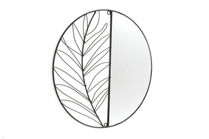 A black wire synergy leaf mirror. A simple and striking piece that would suit any room or any decor. Round Synergy mirror and wire leaf design. The mirror dimensions are 24x48cm Measurements: D50 x H0.5 x W50cm SKU: SY0080