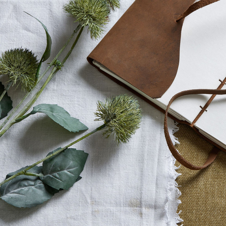 This sculptural artificial stem brings dramatic architectural interest to any floral arrangement. Its spherical globe head, reminiscent of Scottish highlands flora, presents a mesmerizing texture that catches light and creates depth in displays. The botanical authenticity extends through the sturdy stem, replicating the natural variations found in wild thistles. For maximum visual impact, we suggest combining this statement piece with the Gunnii Eucalyptus Spray for airy movement, the Italian White Bellflower for vertical interest, and the Green Craspedia Stem to echo the globe formation. The Variegated Eucalyptus Bouquet adds subtle color transitions that enhance the thistle's unique silhouette. For a meadowland feel, pair with the Faux White Cow Parsley Ammi and Purple Wildflower Small Spray. These combinations create retail-ready arrangements that appeal to customers seeking lasting botanical displays with minimal maintenance requirements. The stem's neutral palette ensures year-round merchandising possibilities, making it a reliable stock item that satisfies contemporary design trends.