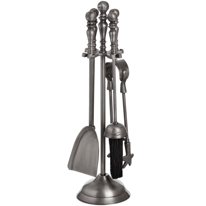 Elevate your fireplace offerings with this exquisite Traditional Companion Set in Antique Pewter. Crafted with meticulous attention to detail, this 5-piece set exudes timeless elegance and functionality. The antique pewter finish adds a touch of sophistication, making it a perfect complement to both classic and contemporary interiors. The set includes essential fireplace tools - tongs, poker, shovel, brush, and a sturdy stand - all designed with intricate detailing on the handles. The ornate finials atop each tool and the stand showcase the craftsmanship that goes into every piece. This companion set isn't just practical; it's a statement piece that will catch the eye of discerning customers. It pairs beautifully with wrought iron accessories, vintage-inspired decor, and rich, warm colour palettes. Suggest displaying it alongside plush throws, leather armchairs, or antique brass accents to create a cozy, inviting atmosphere. Perfect for country homes, traditional estates, or adding a touch of refinement to modern spaces, this companion set appeals to a wide range of interior styles. From rustic lodges to elegant townhouses, it's a versatile addition that combines form and function seamlessly. Stock this timeless piece to offer your customers a blend of practicality and aesthetic appeal. It's not just a fireplace tool set; it's an investment in enduring style and quality that will enhance any hearth for years to come.
