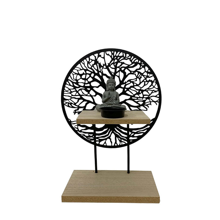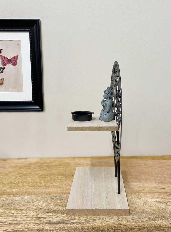 An interesting study is a Tree of Life circular structure made of black metal, elevated from a wood base on two black metal spindles. The smaller upper shelf which is in front of the tree of life image, has a clay sitting Buddha figure behind a black tea light holder tray. The base is W17cm x D11cm x H1.2cm. The upper shelf is W12cm x D9cm x D0.6cm. the tree of life is 20cm diameter on spindles of 13cm tall. The overall height is 26.5cm with space between the shelves of 12.5cm. Measurements: D11 x H26.5 x W19cm