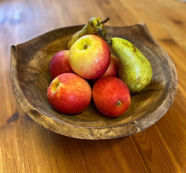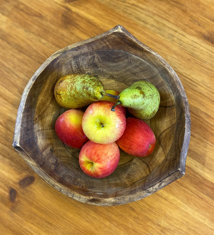A crafted wooden bowl carved in a three point tricorn style. An attractive practical piece that has many uses whilst adding a natural rustic feel to any room. Overall measurements: D8 x H28 x W28cm SKU: KG0870