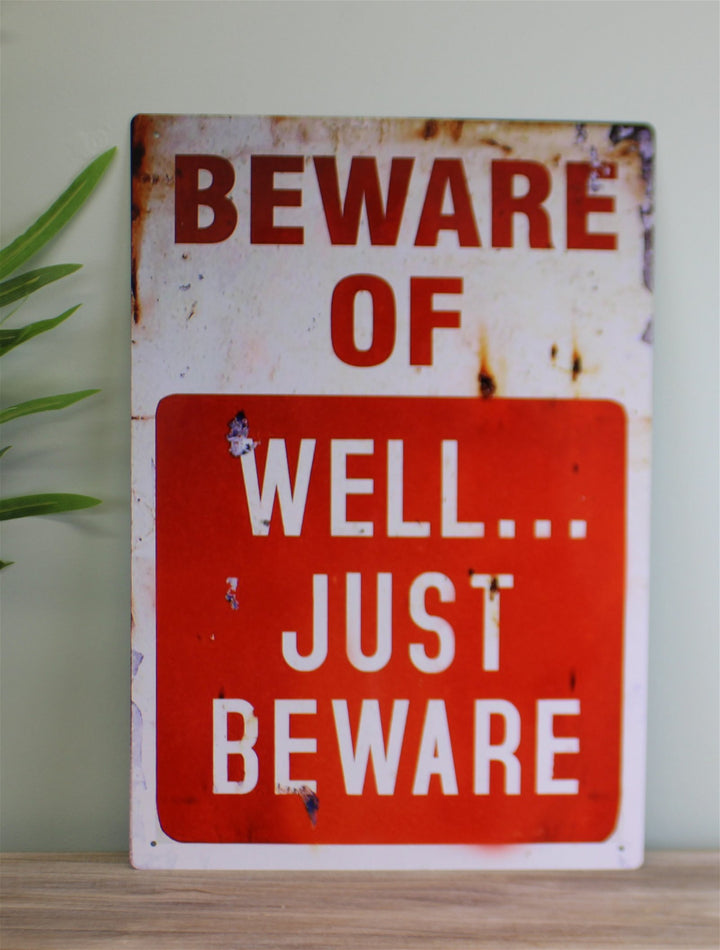 Part of our fantastic new range of reproduction vintage metal signs. Retro Beware Of… sign. Made in the UK from aluminium, suitable for use inside or outside. Every poster features 4 drill holes for ease of fixing to the wall. Measurements: 0.1 x 40 x 28cm