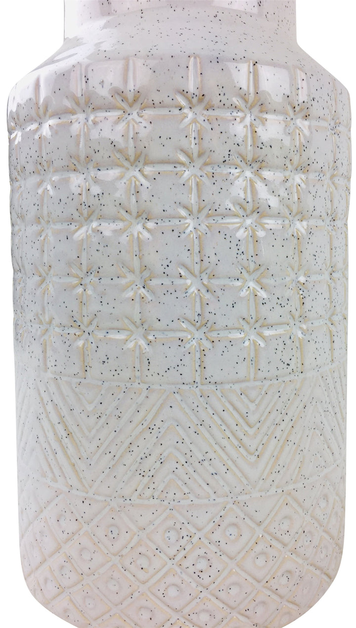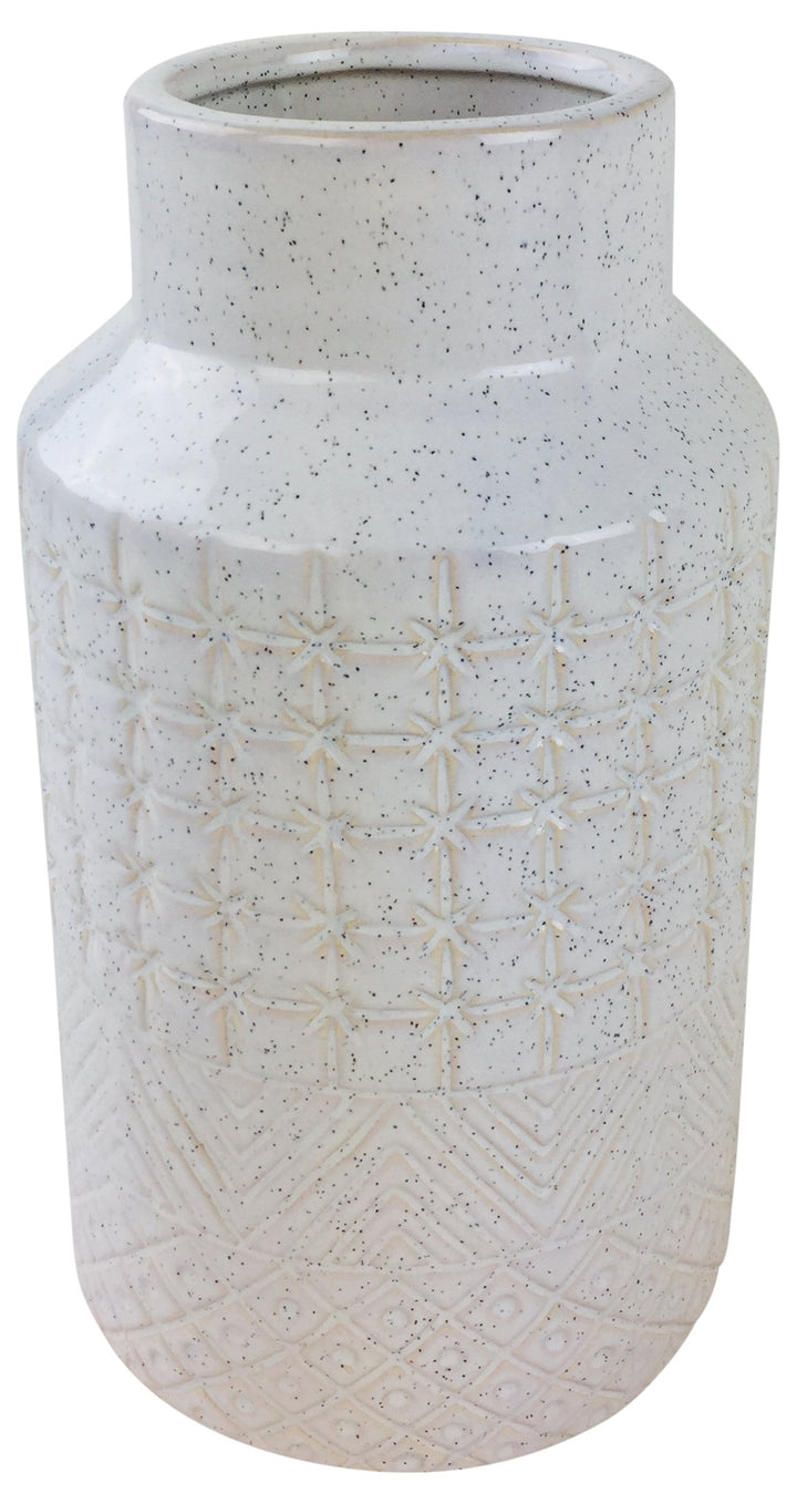 A white stoneware vase with a lovely textured pattern engraved across the exterior. The design utilises various shapes and stars with multiple black dots to give an overall unique look to the vase. A perfect way to stylishly put on display your flowers and plants! The planter has a smooth glazed finish which really comes out under lighting. There are four pads on the bottom to prevent marking surfaces. Measurements: W17cm D17cm H30cm. Top opening diameter =14cm. SKU: WF2343