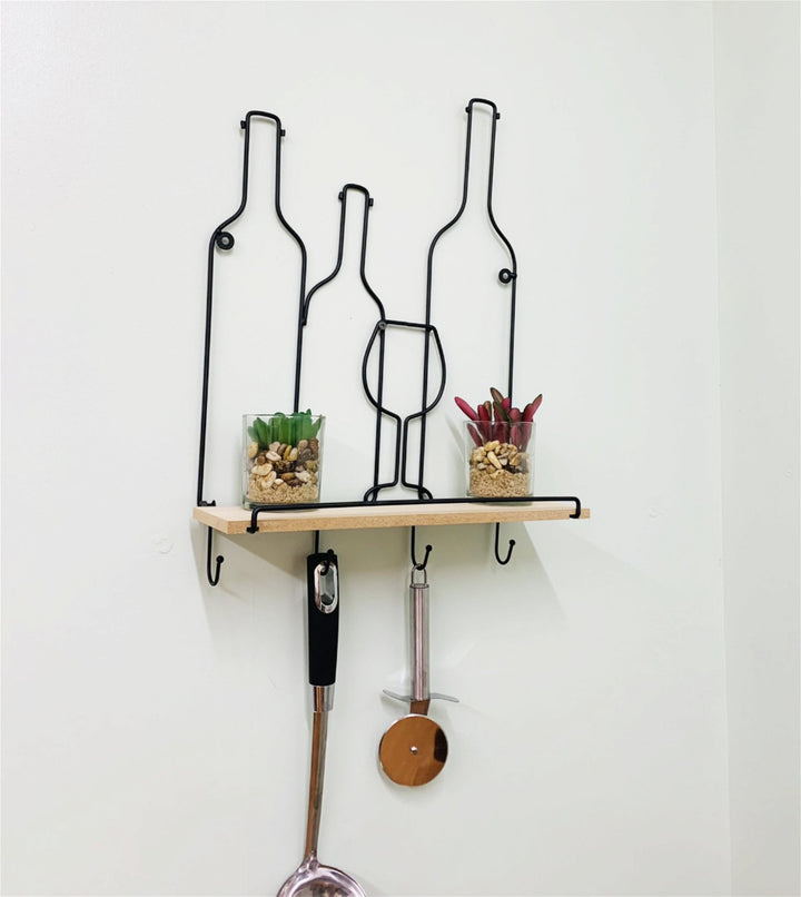 A black wire design shelf with hooks. The wire design is of three bottles and a wine glass, with a foldable MDF shelf and four hooks beneath. Th wall hanging bottle shelf with wire cut outs of 3 wine bottles and a glass measures 41cm. The pull down MDF shelf measures 34.5x10x0.5cm and 4 hooks below the shelf which are10cm apart. Overall measurements: D12 x H48 x W33cm SKU: KG1032