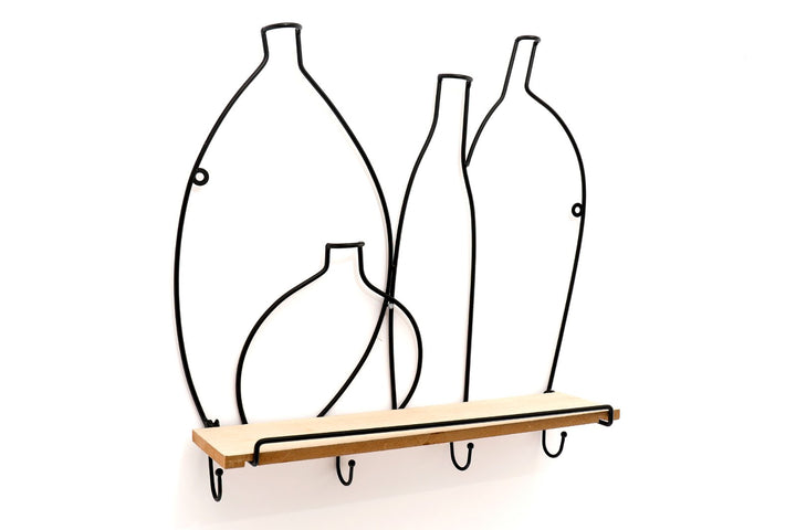 This shelving unit of black sculptured wire depicts four wine bottle shapes, with a shelf and four hooks. The styling befits any culinary area and is both practical and attractive. Wall hanging wire shapes of 4 bottles (40x34.5cm) with a pull down MDF shelf measuring 36x9x0.5cm with 4 hooks below with a distance between of 11 cm. The unit overall measurements are: D11 x H41 x W40cm SKU: WF2508