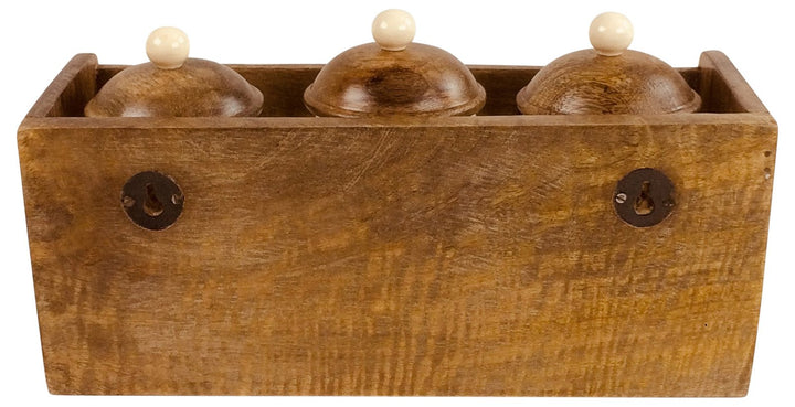 Wooden rack holding three ceramic jars each with TEA, COFFEE & SUGAR printed on the front. The jars have wooden lids ceramic knobs and rubber seals to keep them air tight. The wooden frame holding the jars is either free standing or wall mountable. Each jar measures W9.5cm x D9.5cm x H15cm. The opening diameter of the jars are 6.9cm. The lid diameter is 8cm. The overall size is 32.5cm wide, 13cm deep and 16.5cm heigh. Can be free standing or wall mountable.